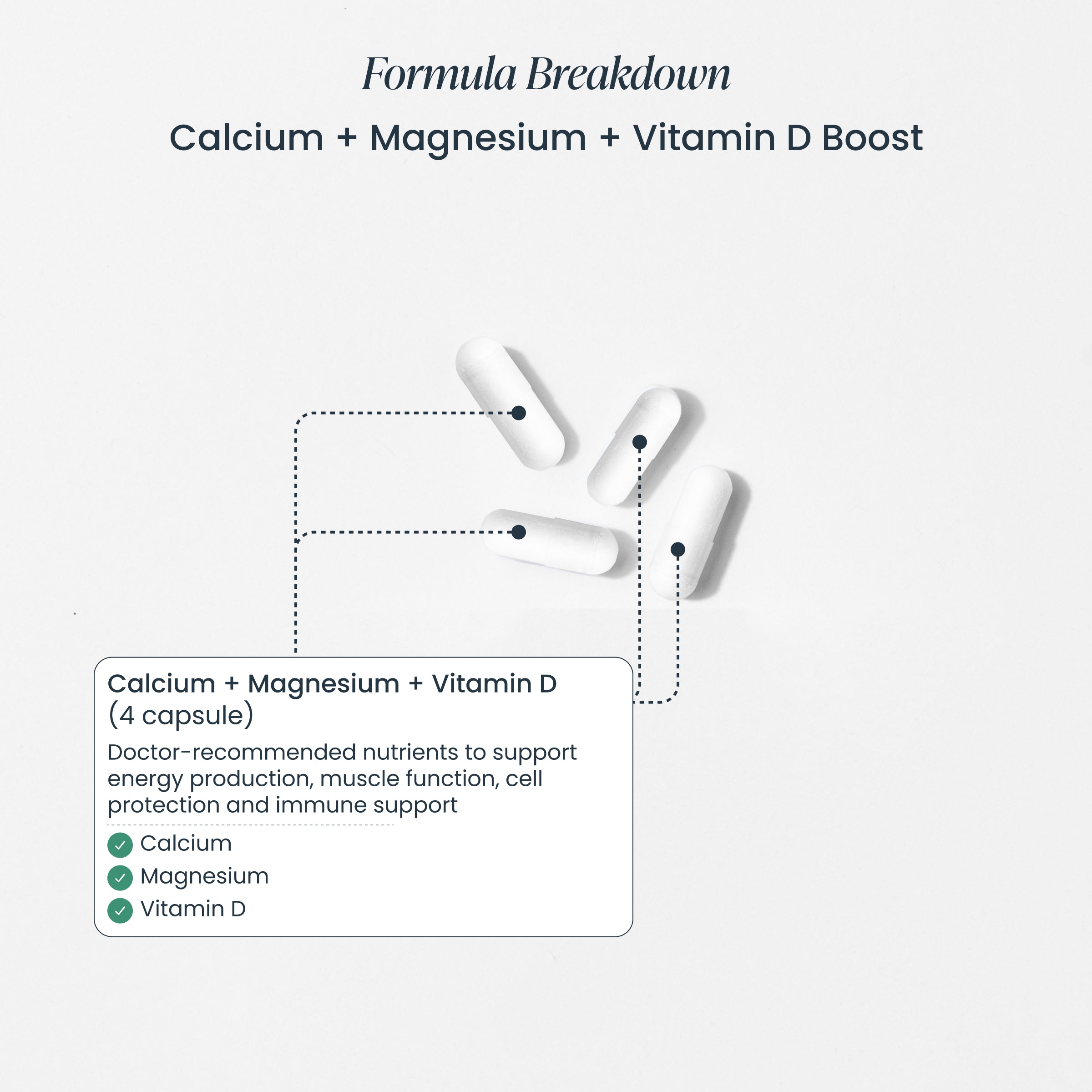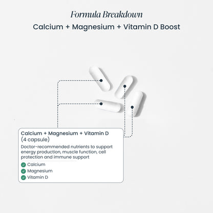 Calcium + Magnesium + Vitamin D Boost Serving size: 4 capsules Servings per box: 30 Amount per serving % daily value Calcium (as Calcium Citrate) 350 mg 27% Magnesium (as magnesium bisglycinate) 200 mg 48% Vitamin D3 (as cholecalciferol) (Vegan) 25 mcg 125%
