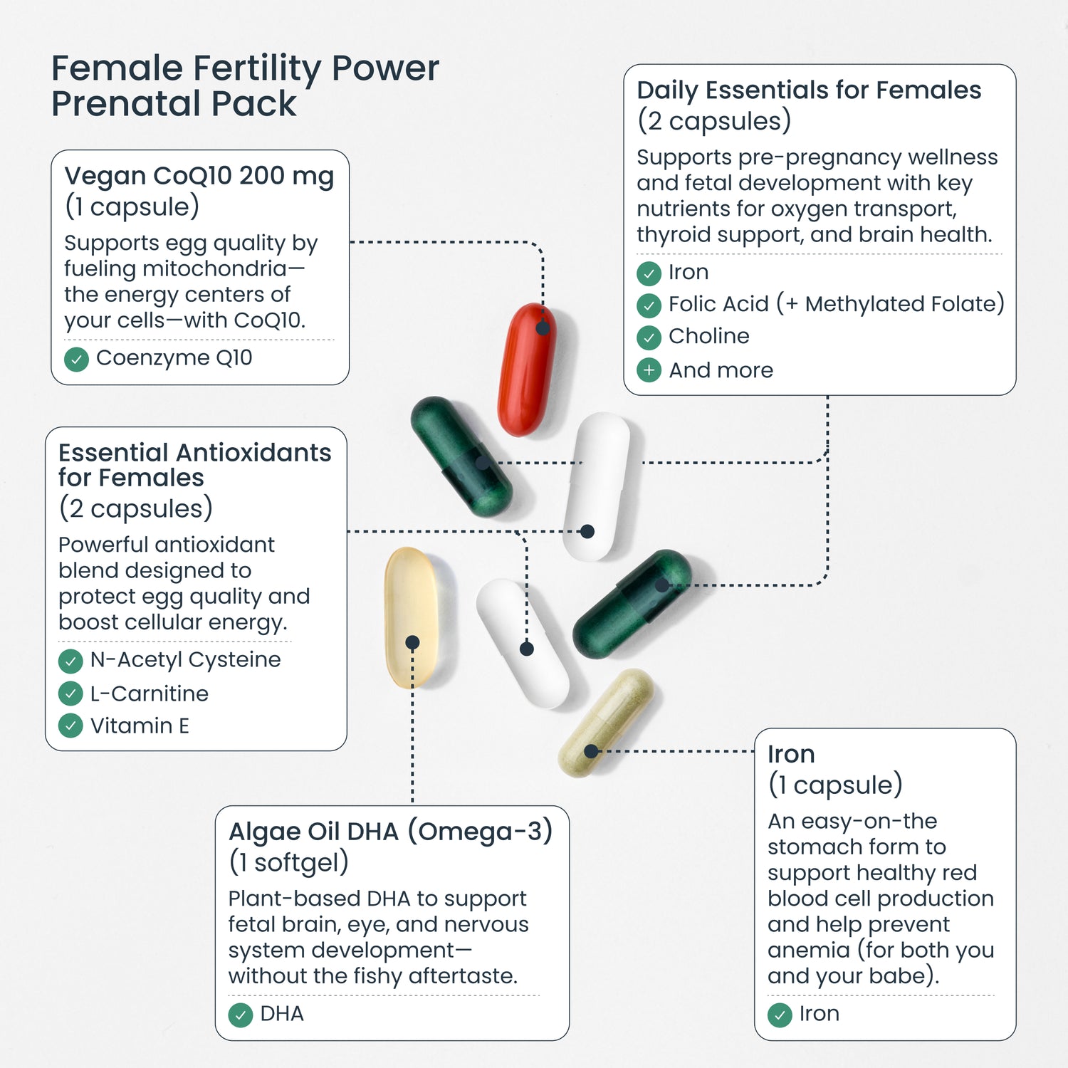 Daily Essentials for Females Serving size: 2 capsules Servings per box: 30 Amount per serving % daily value Vitamin A (as retinyl palmitate) 540 mcg RAE 42% Vitamin B1 (as thiamin HCL) 5 mg 357% Vitamin B2 (riboflavin) 1.5 mg 94% Niacin (as niacinamide) 30 mg 167% Pantothenic acid (as calcium D-pantothenate) 10 mg 143% Vitamin B6 (as pyridoxal-5-phosphate) 25 mg 1250% Vitamin B12 (as methylcobalamin) 500 mcg 17857% Vitamin C (as ascorbic acid) 100 mg 83% Vitamin D3 (as cholecalciferol) (vegan) 25 mcg 167% Vitamin E (as d-alpha-tocopheryl acid succinate) 17 mg 89% Biotin 50 mcg 143% Choline (as choline bitartrate) 150 mg 27% Chromium (as chromium citrate) 100 mcg 222% Copper (as copper citrate) 2 mg 154% Folate (as 400 mcg folic acid, 600 mcg calcium L-5-methyltetrahydrofolate) 1 mg 278% 1,667 DFE Iodine (as potassium iodide) 220 mcg 76% Magnesium (as magnesium citrate) 20 mg 5% Molybdenum (as molybdenum citrate) 50 mcg 100% Selenium (as selenium HVP chelate) 100 mcg 143% Zinc (as zinc bisglycinate) 13 mg 100%