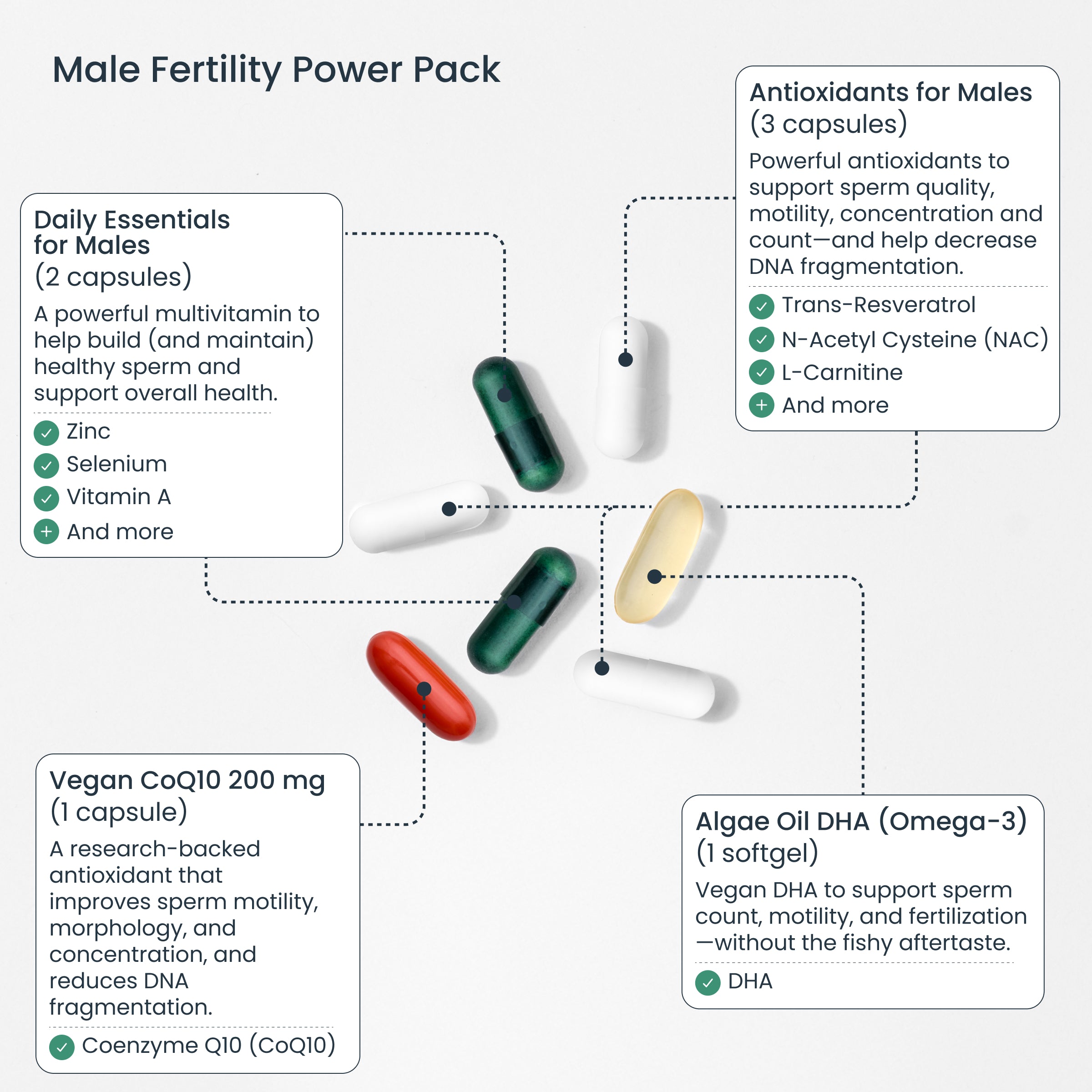 Daily Essentials for Males Serving size: 2 capsules Servings per box: 30 Amount per serving % daily value Vitamin A (as retinyl palmitate) 540 mcg RAE 60% Vitamin B1 (as thiamin HCL) 5 mg 417% Vitamin B2 (riboflavin) 1.5 mg 115% Niacin (as niacinamide) 30 mg 188% Pantothenic acid (as calcium D-pantothenate) 10 mg 200% Vitamin B6 (as pyridoxal-5-phosphate) 25 mg 1,471% Vitamin B12 (as methylcobalamin) 500 mcg 20,833% Vitamin C (as ascorbic acid) 100 mg 111% Vitamin D3 (as cholecalciferol) (vegan) 25 mcg 125% Vitamin E (as d-alpha-Tocopheryl acid succinate) 17 mg 113% Calcium (as calcium citrate) 50 mg 4% Choline (as choline bitartrate) 100 mg 18% Folate (as 400 mcg folic acid, 600 mcg calcium L-5-methyltetrahydrofolate) 1 mg 417% Magnesium (as magnesium citrate) 20 mg 5% Selenium (as selenium HVP chelate) 100 mcg 182% Zinc (as zinc bisglycinate) 25 mg 227%