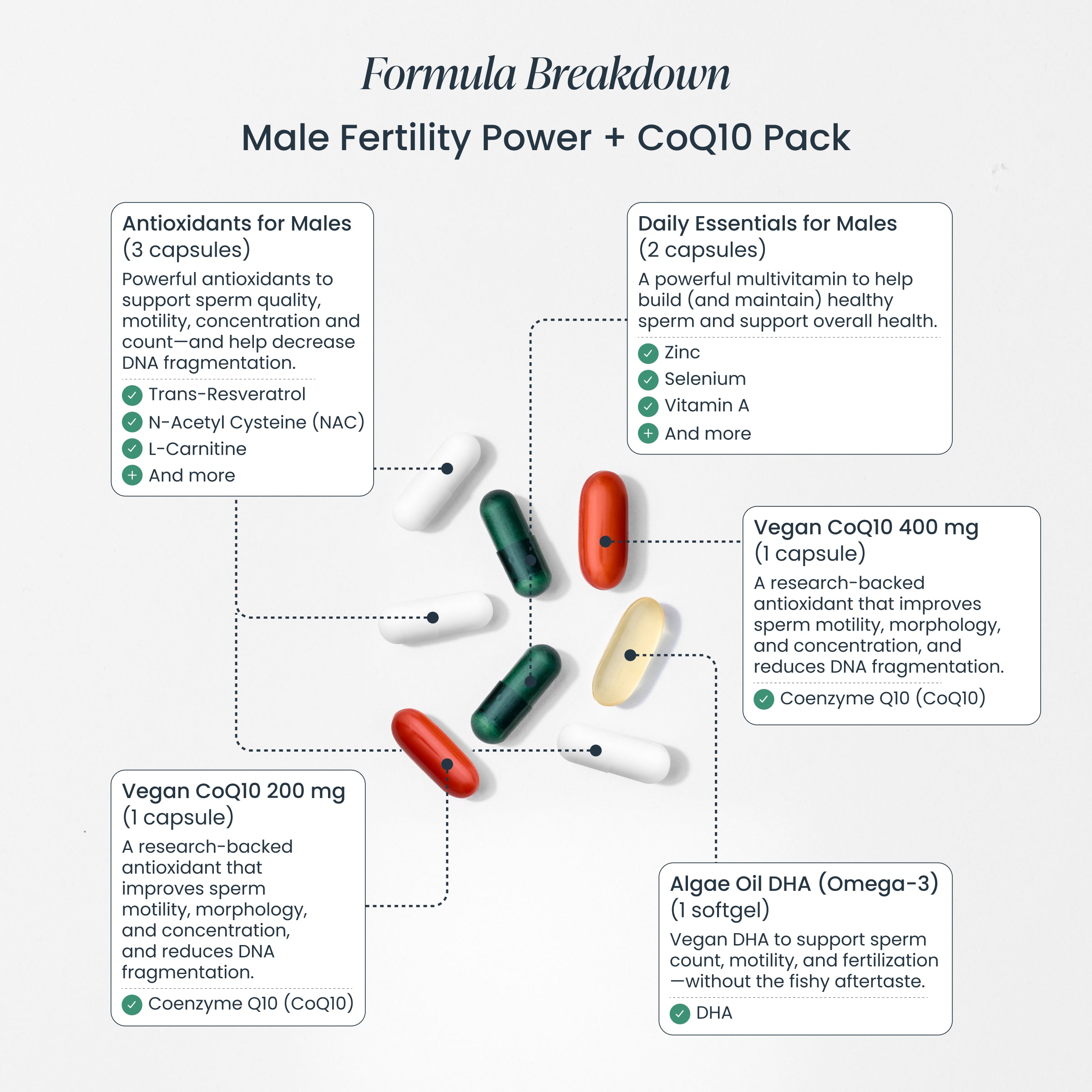 Daily Essentials for Males Serving size: 2 capsules Servings per box: 30 Amount per serving % daily value Vitamin A (as retinyl palmitate) 540 mcg RAE 60% Vitamin B1 (as thiamin HCL) 5 mg 417% Vitamin B2 (riboflavin) 1.5 mg 115% Niacin (as niacinamide) 30 mg 188% Pantothenic acid (as calcium D-pantothenate) 10 mg 200% Vitamin B6 (as pyridoxal-5-phosphate) 25 mg 1,471% Vitamin B12 (as methylcobalamin) 500 mcg 20,833% Vitamin C (as ascorbic acid) 100 mg 111% Vitamin D3 (as cholecalciferol) (vegan) 25 mcg 125% Vitamin E (as d-alpha-Tocopheryl acid succinate) 17 mg 113% Calcium (as calcium citrate) 50 mg 4% Choline (as choline bitartrate) 100 mg 18% Folate (as 400 mcg folic acid, 600 mcg calcium L-5-methyltetrahydrofolate) 1 mg 417% Magnesium (as magnesium citrate) 20 mg 5% Selenium (as selenium HVP chelate) 100 mcg 182% Zinc (as zinc bisglycinate) 25 mg 227%