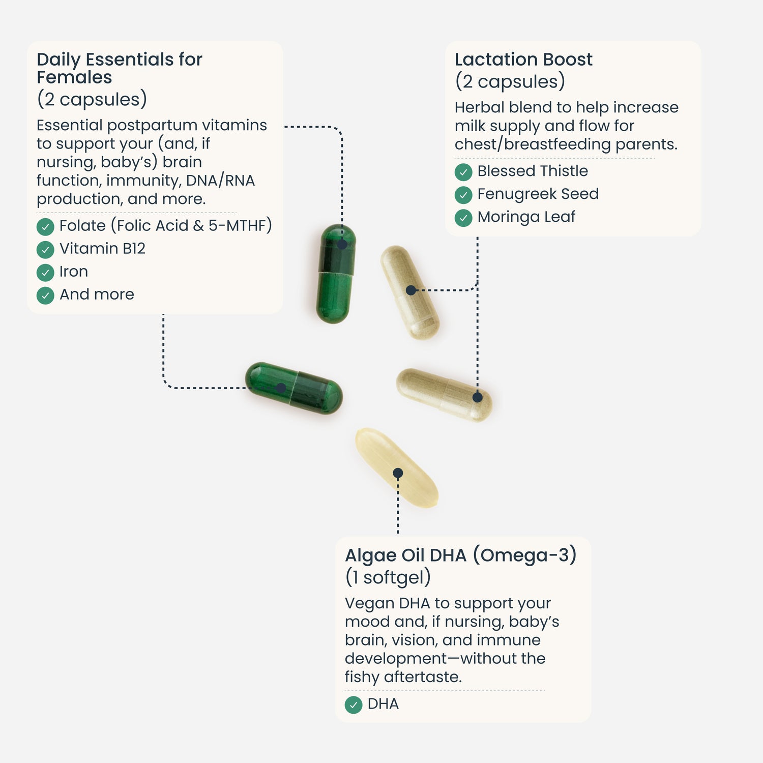 Every cell in your body needs this omega-3 fatty acid, but it’s not something you produce naturally and many diets fall short. Postpartum, DHA is passed to the baby via chest/breastmilk to support cognitive, visual and immune system development. The DHA levels in milk can vary widely—it depends entirely on how much the chest/breastfeeding person consumes. To make it easier on you, our vegan DHA comes from algae oil so there’s no fishy aftertaste.