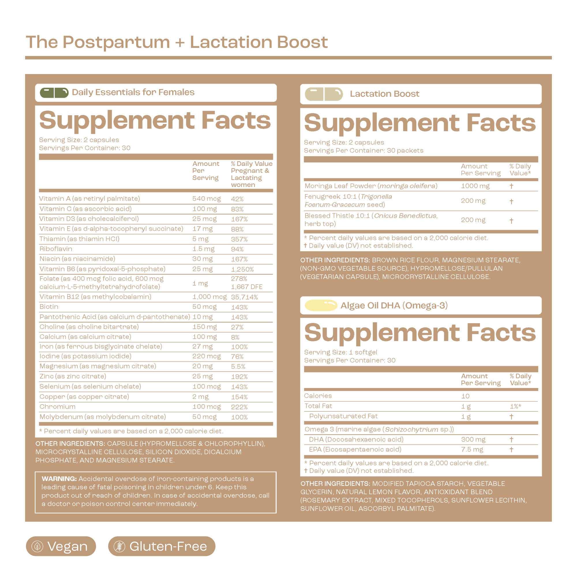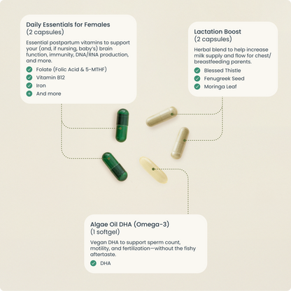 Daily Essentials for Females Serving size: 2 capsules Servings per box: 30 Amount per serving % Daily Value Vitamin A (as retinyl palmitate) 540 mcg RAE 42% Vitamin C (as ascorbic acid) 100 mg 83% Vitamin D3 (as cholecalciferol) 25 mcg 167% Vitamin E (as d-alpha-tocopheryl succinate) 17 mg 88% Thiamin (as thiamin HCI) 5 mg 357% Riboflavin 1.5 mg 94% Niacin (as niacinamide) 30 mg 167% Vitamin B6 (as pyriodoxal-5-phosphate) 25 mg 1,250% Folate (as 400 mcg folic acid, 600 mcg calcium-L-5-methyltetrahydrofolate) 1 mg 287% 1,667 DFE Vitamin B12 (as methylcobalamin) 1,000 mcg 35,714% Biotin 50 mcg 143% Pantothenic Acid (as calcium d-pantothenate) 10 mg 143% Choline (as choline bitartrate) 150 mg 27% Calcium (as calcium citrate) 100 mg 8% Iron (as ferrous bisglycinate chelate) 27 mg 100% Iodine (as potassium iodide) 220 mcg 76% Magnesium (as magnesium citrate) 20 mg 5.5% Molybdenum (as molybdenum citrate) 50 mcg 100% Selenium (as selenium chelate) 100 mcg 143% Copper (as copper citrate) 2 mg 154% Zinc (as zinc citrate) 25 mg 192%